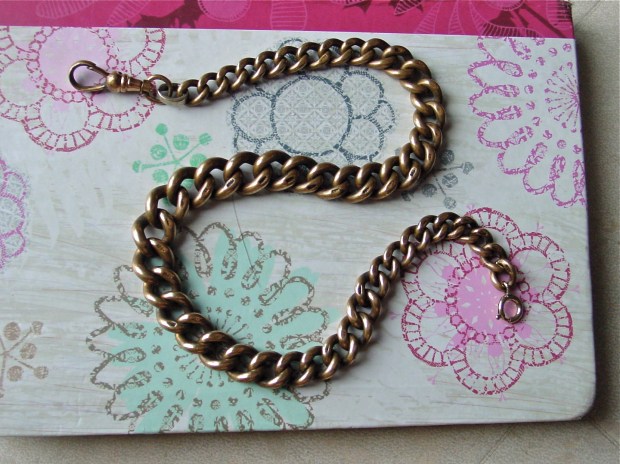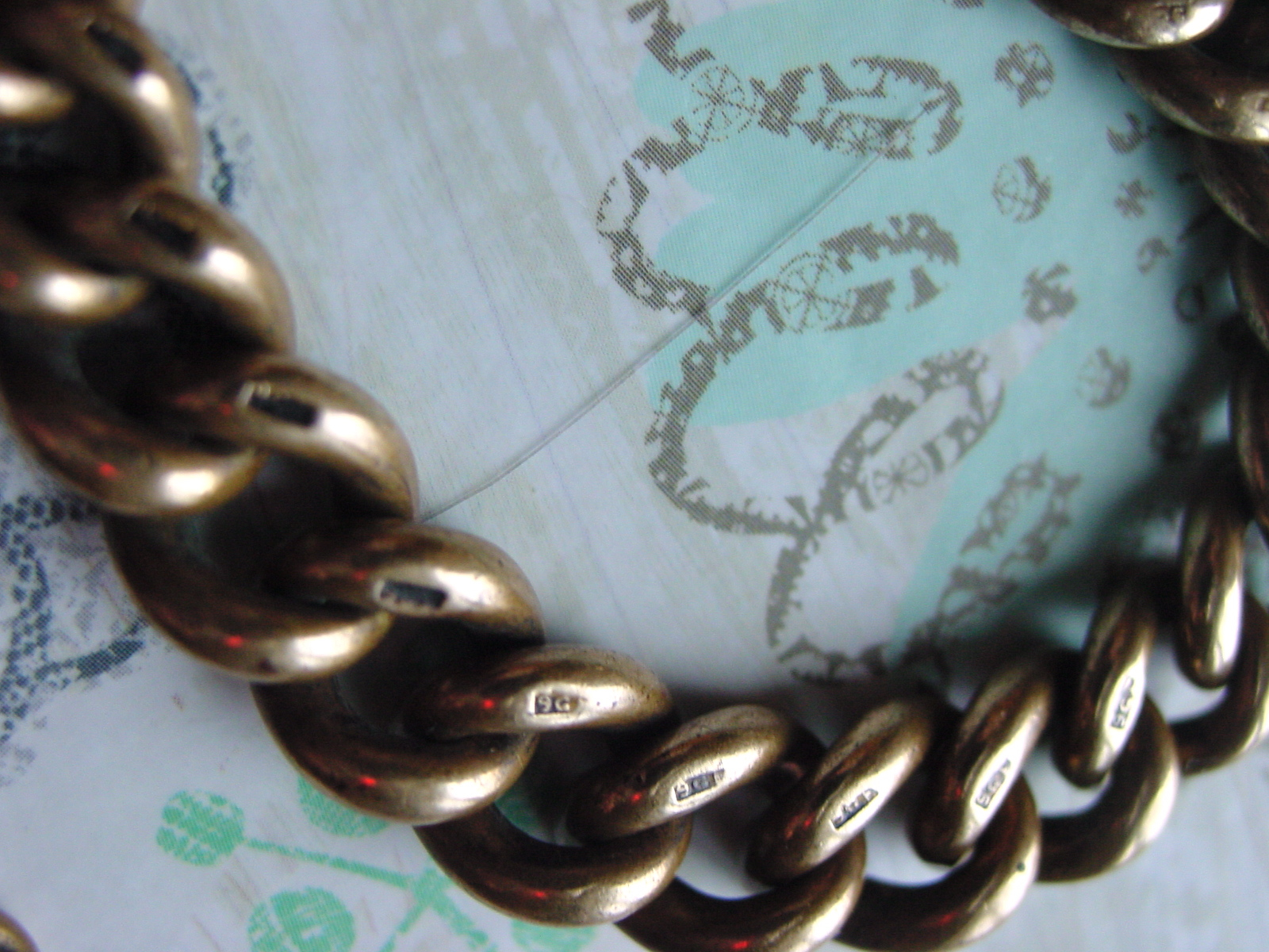 I wanted it because it had two Enicar automatics that seemed to be in running order. There were also a couple of watch chains and mostly it’s always fun to spend a couple of hours rooting through a box of treasure. And this time there was treasure: I noticed that one of the watch chains, which I had assumed to be brass had little marks on every link.