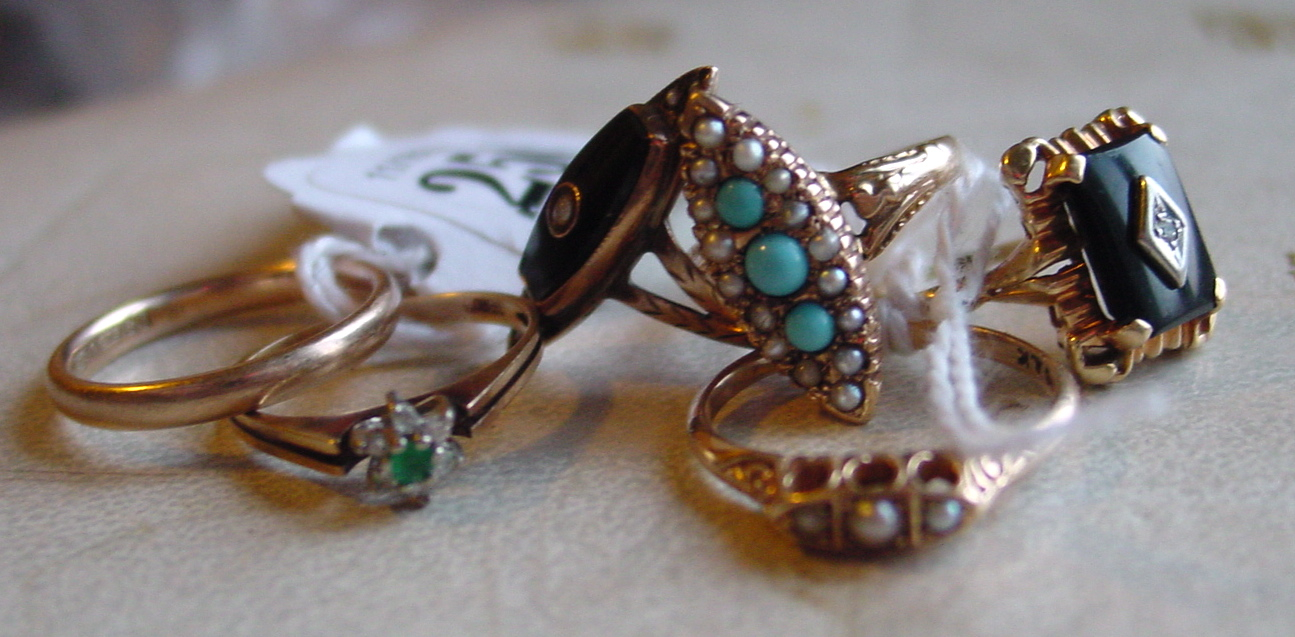 Pictured above is a mix of dainty little rings, including a Victorian black onyx and seed pearl ring, a 1930s Victorian Revival Onyx ring with a tiny diamond, a 9ct gold wedding band, a mini emerald and diamond ring, a wee pearl ring and a Victorian Revival turquoise ring. Pictured below, two dainty diamond rings.