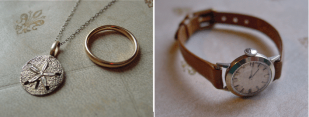 And finally, some simple jewels. Pictured above: a vintage Danecraft sterling sand dolllar pendant, a 9ct gold wedding band dated 1906, and a 1950s-era Longines Watch.