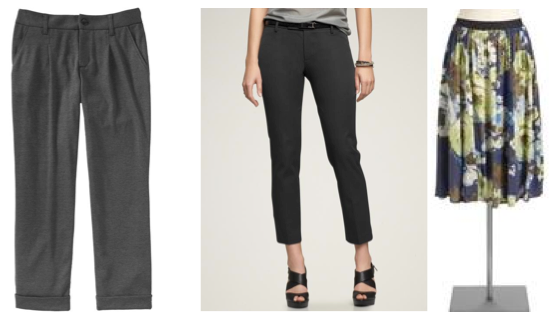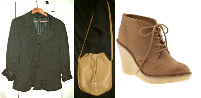 As my figure is pretty unstructured right now, I need a a tailored jacket to pull it all together. I got this peplumed jersey blazer by Sandro a month or so ago at Winners. And don’t forget accessories: Above middle and right are a vintage yellow leather drawstring purse that I’ve had for years and sueded desert wedges from Old Navy (that’s the end of it, I swear — although can I mention that I ordered these things Thursday and they arrived Sunday morning?)