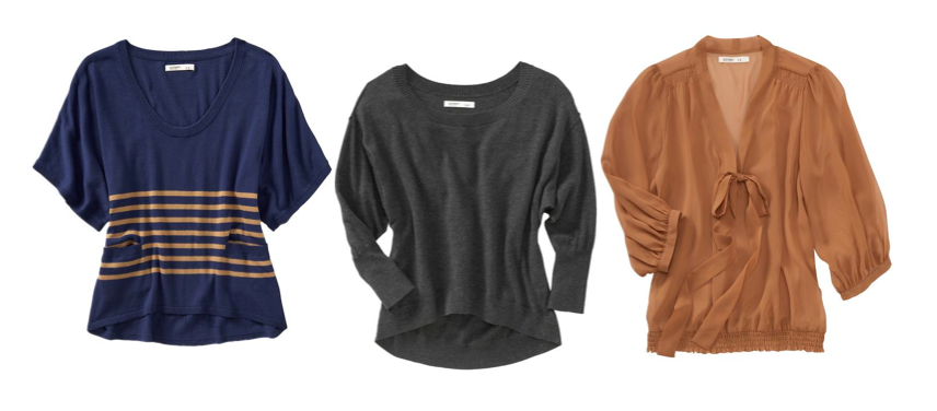 In a real fever fueled act, I went online and ordered a bunch of clothes from Old Navy on Thursday night. I hadn’t seen the movie yet, but I think these unstructured sweaters and sheer, tie neck blouse have a Gallic sensibility.