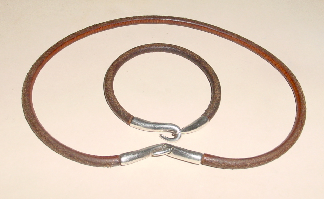 Leather jewellery wasn’t really on my radar but lately I’ve been digging the way it looks. It has a rough, handwrought quality that really works with my horsey set feeling. Above, I tried out a braided leather strap on a 1940s-era Curtiss watch. Below, an sterling and leather, no doubt Hermès-inspired “bit” bracelet and necklace (I’ve been wearing the necklace wrapped around my wrist). The pair together were $4.
