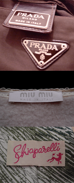 When researching vintage designer stuff, it’s good to have some resources to compare labels and signatures to help you date and compare. An even better thing would be to share these resources. Today it’s time for a tribute to the above bella donnas with some examples of 1990s-era Prada, Miu Miu and 1950s Schiaparelli.