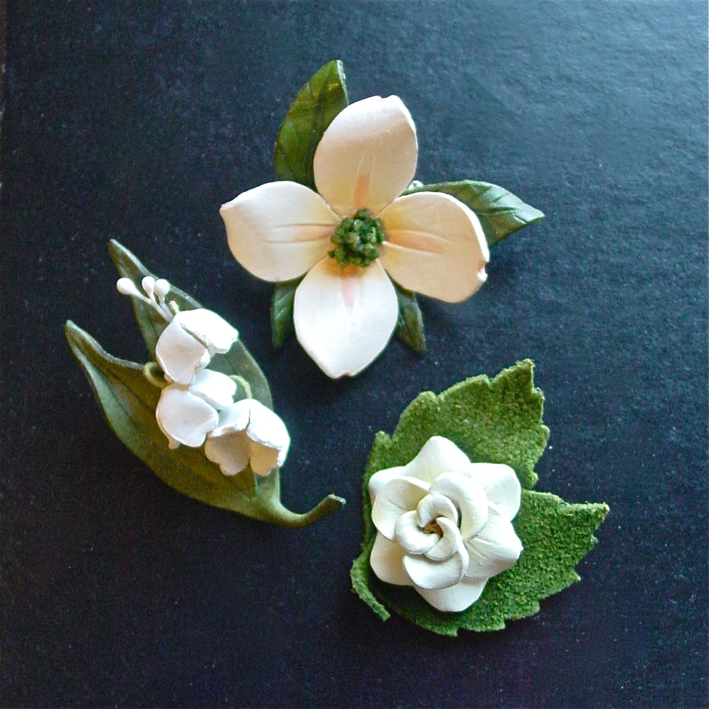 It’s turning into a Canadiania-o-rama this week on the ol’ Gracious Good blog. Today we’ve got the last of my K-W VV finds: a trio of white floral brooches made of leather and stamped “CANADA” on the back. I wore them pinned in a bunch on a sweater on Monday and attracted many complements.