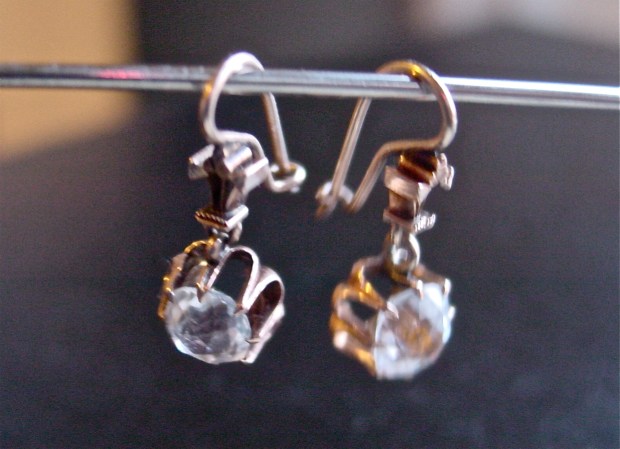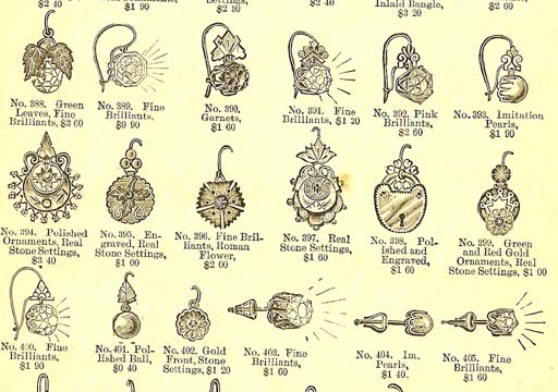 One of the best resources for researching vintage jewellery is Morning Glory Collects. They have an amazing collection of cool old jewels, but they also offer a wealth of research through their Jewel Chat magazine. Whilst perusing their Victorian pages, I came across a catalogue from 1888 which depicted a pair of paste “brilliants” very similar to the pair I’ve pictured below. So now I have a better idea of the age of my earrings. And I can also marvel at the original price of $1.20 for the rolled gold versions (pictured above).