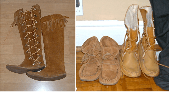 Whilst out buying presents for my family for Christmas, I bought myself a pair of Laurentian Chief fringed mocassins (pictured above, middle). I thought I’d take this occasion to tell you about my first pair of mocs. I bought them a a gift shop at Frontierland in Disneyworld when I was, like, 17. Since then I’ve always had at least one pair on the go. I’ve even made a few myself. I consider mocassins my signature footwear, although my old, aching feet protest if I walk too far in them.