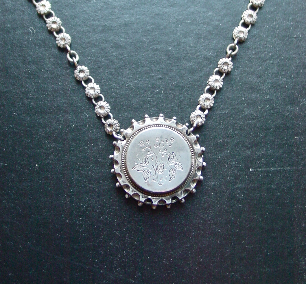 Like many old things, it must’ve broke at some point. But an enterprising soul treasured it enough that they punched some holes in it, attached some odds and ends of chains and made it into a necklace (it wasn’t me — I found it like this). Anyway, a great way to salvage something that might’ve otherwise been scrapped.