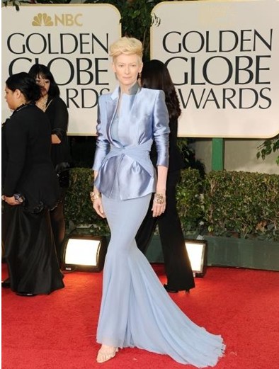 Watched the Golden Globes with my mom on Sunday night. There were lots of well-buttressed high Hollywood glam styles, I was most attracted to softer colours or more avant garde looks. Number one in my books was Tilda Swinton’s pale blue Haider Ackermann ensemble. To make the red-carpet-ready, she wore a retro-era 1940s sapphire, diamond and 18 carat gold coil cuff bracelet and a bunch of Edwardian diamond and platinum brooches, all from Fred Leighton.