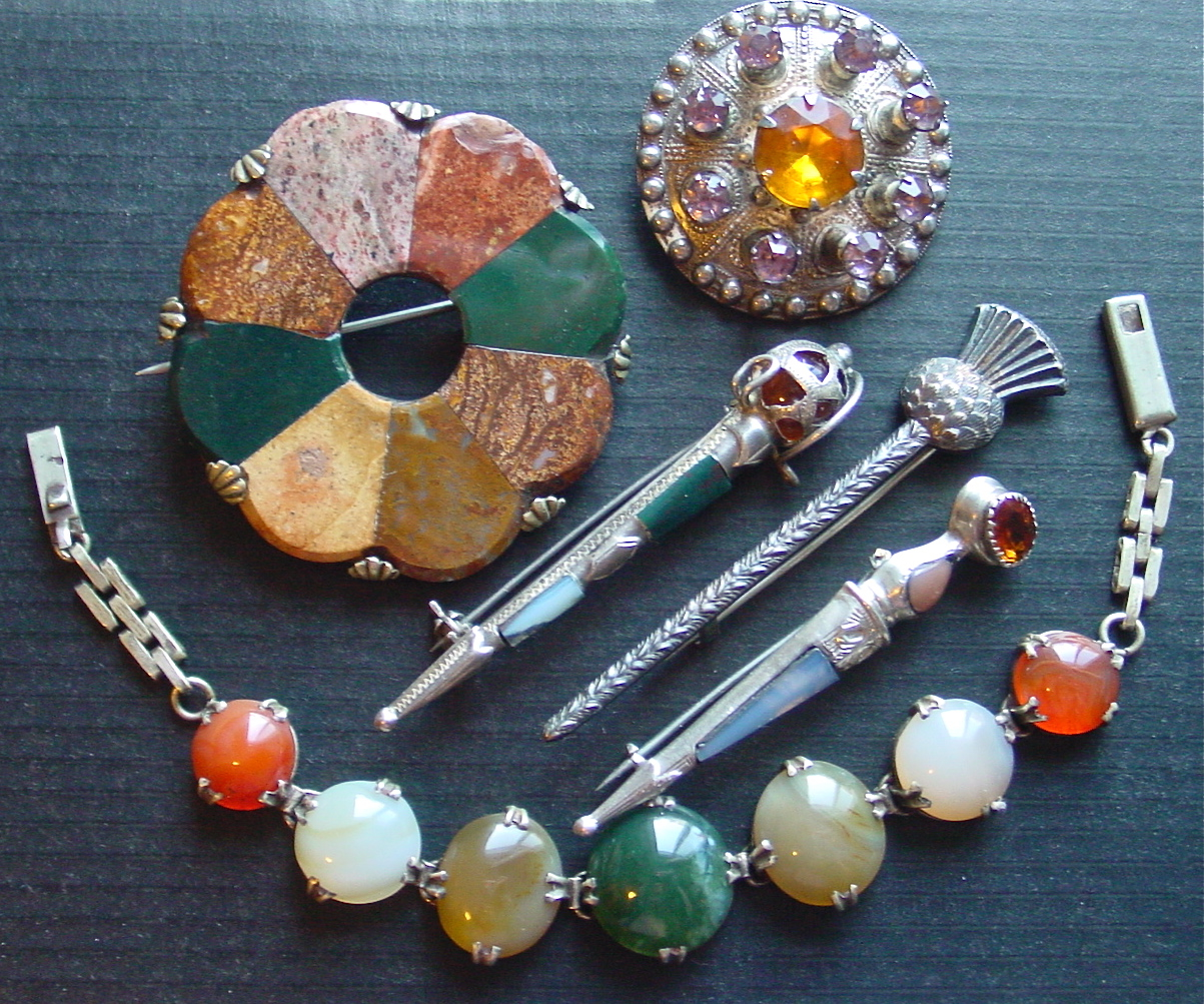 As is tradition, I will celebrate Robbie Burns Day with posting pictures of all things Scots. This year we have some Victorian pebble jewellery as well as some kilt pins (the one in the shape of a sword is hallmarked 1891) and an 1950s-era brooch. Being 1/4 Scot, I’ve got tonnes more Scottish things (like this Pat Albeck-designed, thistle patterned tea towel) but I’ll have to save something for next year, right?