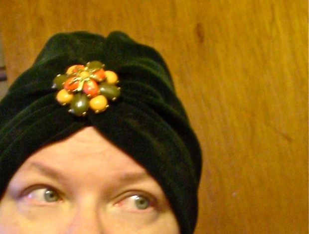 I bought this green velvet toque for $5 at a boxing day sale. I removed the kinda Hogwartsian badges and scrunched up the front with a brooch to turn it into a turban. You know, something I could wear with my black velvet opera cape. While I’m pleased with the result, I now realize that I don’t have the right head shape for turbans.