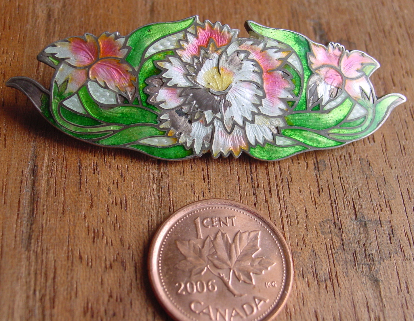 Don’t have this brooch anymore. Sadly I cannot tell you the maker, but I seem to recall that it was an American jewellery concern that went out of business during WW1. As you can see, the enamel is quite damaged. One can still appreciate the rich colour and graceful lines of the design.