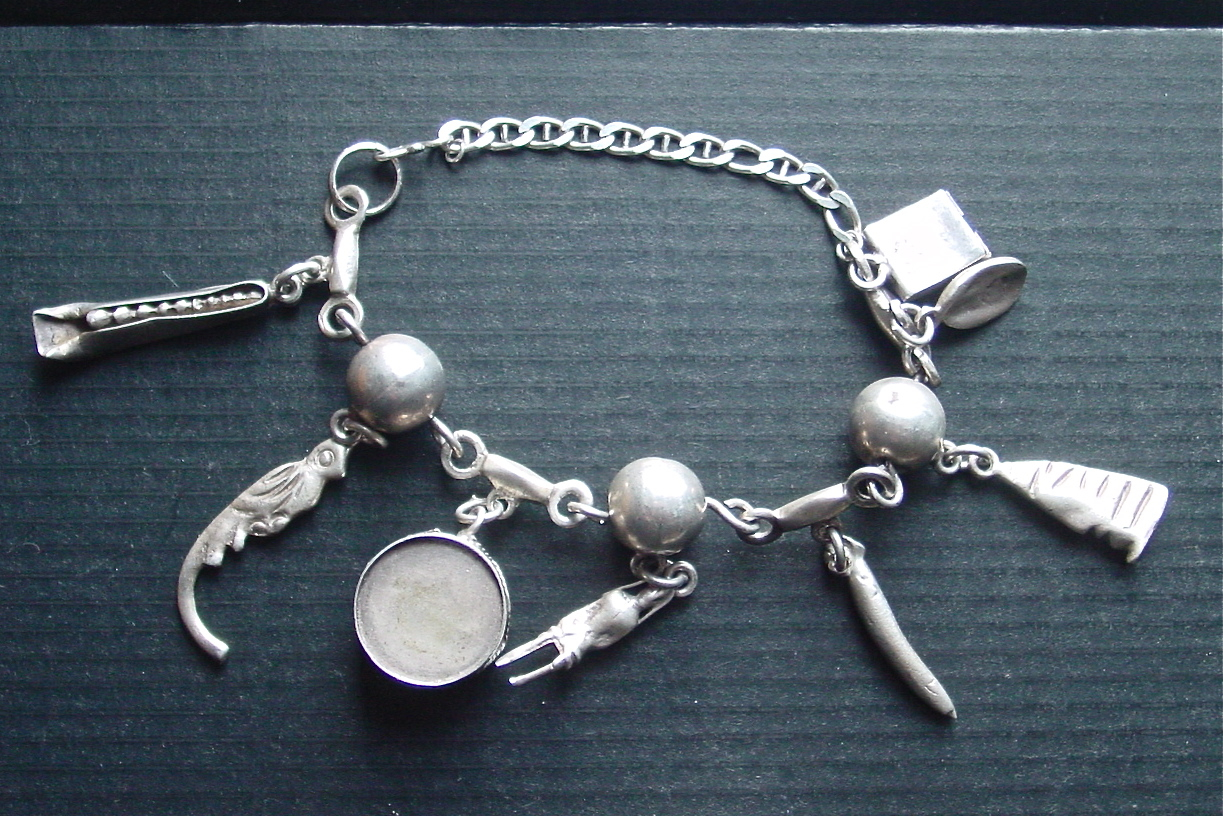 Found a very early (pre-1950s) Mexican silver bracelet with Precolumbian-style charms. It is marked FD Sterling Mexico inside a laurel. I found the same mark on the Maestros de Taxco site, and they thought the maker was from Mexico City. The only problem was that it was missing a link and the male end of the clasp. To make it wearable for the time being, I added a bit of a broken sterling anchor link bracelet that I had. In the meantime, I’ll troll the internets searching for another broken bracelet to make a marriage with.