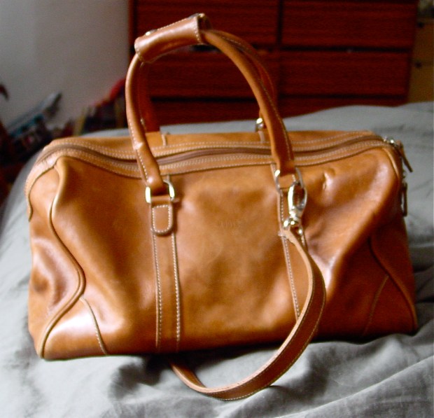 This is my trusty old Roots leather kit bag. I got it as a gimme thing at least a decade ago (a beauty company sent over samples of their new product launch, and it came in this lovely satchel). It has proven to be a hardy weekender — you can cram an astonishing amount of stuff in there. And when I’m at-home entertaining, I sweep all the clutter on my dresser into the sac to hide it. No need to hide the bag, though. It always looks lovely.