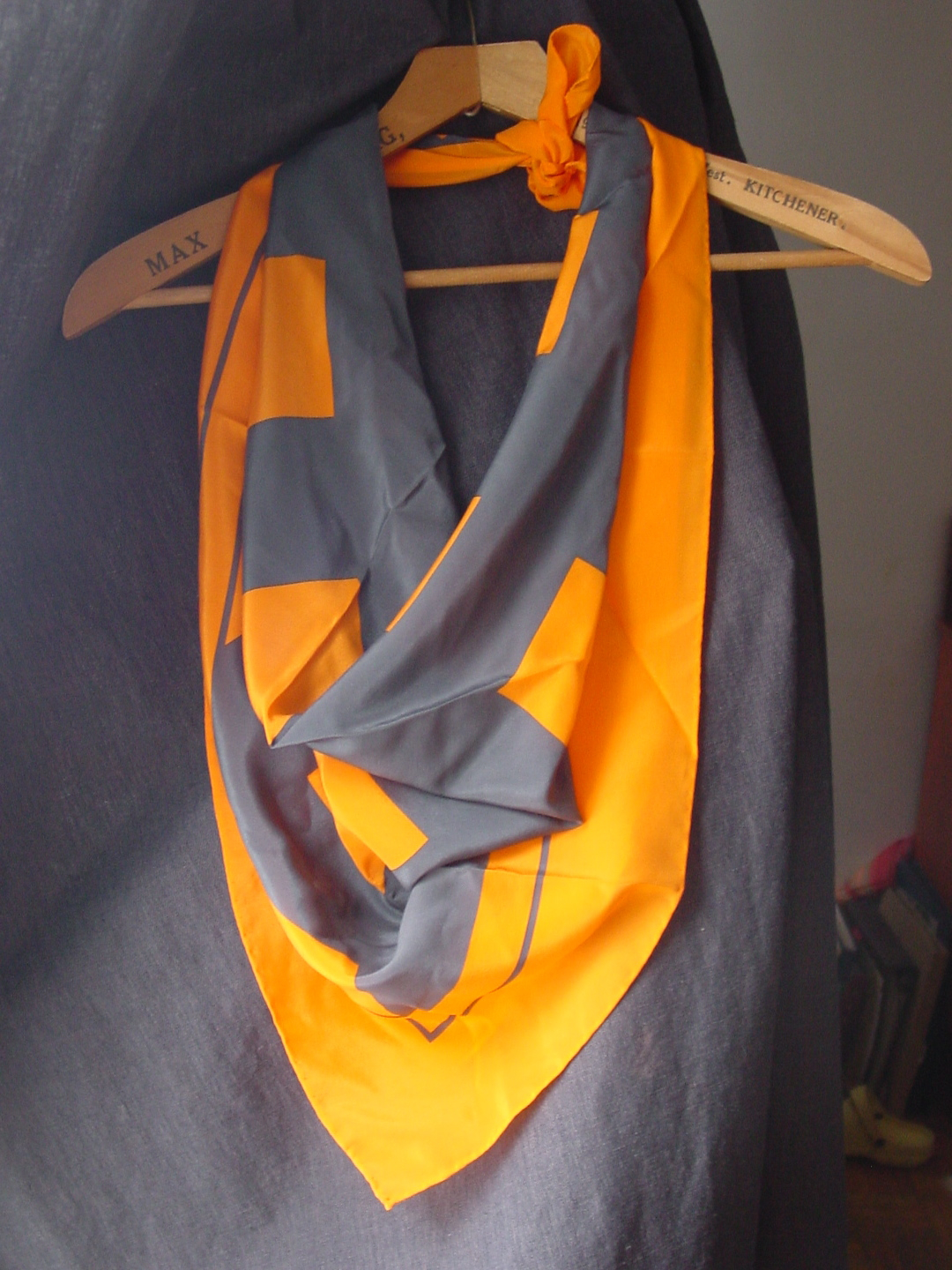 Check out the groovy tangerine and grey silk scarf I found at the Value Village. It has a tag on it which says Ratiopharm, which is a pharmaceutical company that makes generic drugs. I’m guessing that this scarf was made for employees or representatives to wear at trade shows or conventions. But because it is so strikingly graphic, I don’t think anybody is going to mistake me for a pharmacist in it.
