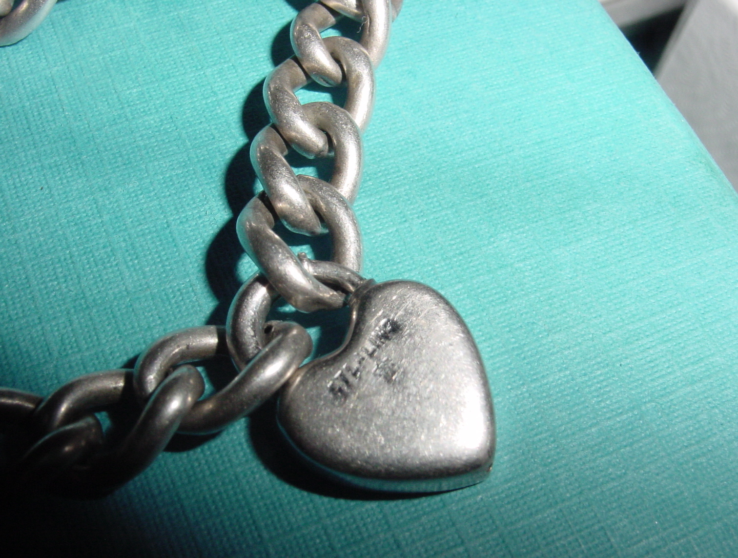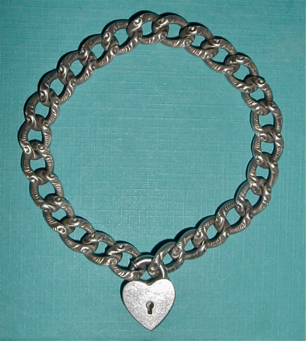 I found this repoussé curb link bracelet at the St. Lawrence Market a while back. I knew as soon as I saw it that it was missing a heart-shaped padlock (I had a similar bracelet before, but it wasn’t in as good shape). I trolled eBay for months trying to find a nice puffy repoussé lock, but this style of bracelet seems to be coming more desirable and I got outbid every time. Finally I won an auction for a plainer clasp from the same era. Well the chain might be a decade or two older.
