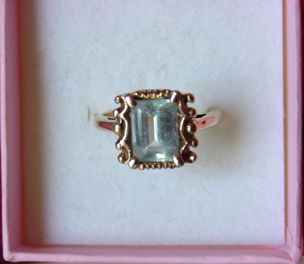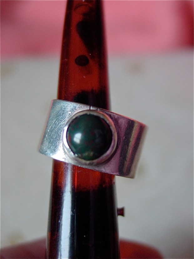 Every month has more than one birthstone. Usually I just pick one, but I could not decide between these two rings — a bloodstone (aka heliotrope) ring that I made myself and an aquamarine that I had reset in a mount I found at the Value Village. So I chose them both.