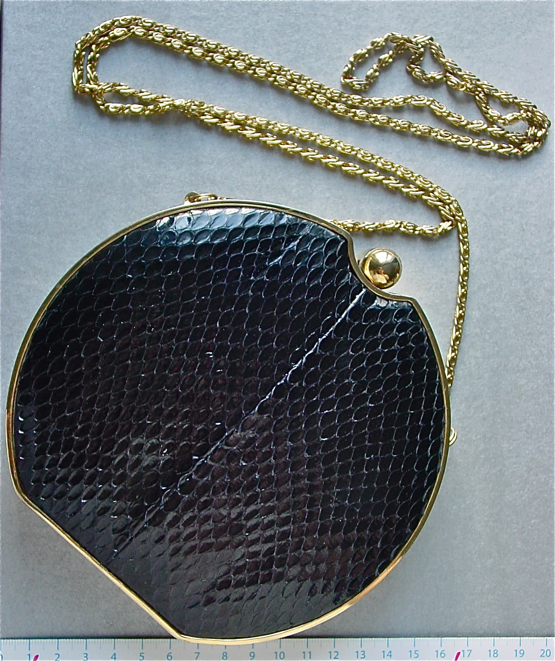 We called this kind of hardshell evening bag a disco purse when we were young because it had a long strap so that you could wear it almost like a necklace when you got up to dance. You see, we were afraid of leaving our purse at a table while we danced lest someone steal our money (we were little punks and freaks, we were not going to discos). We were equally self conscious of what we called the “rec chick dance” which involved putting your purses on the dance floor and then circling around them while you gyrated.