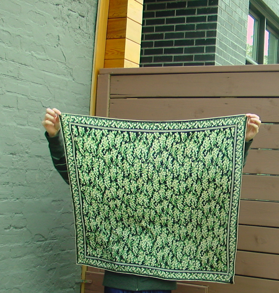 I’m digging the floral prints for spring. I’m also enamoured of the colour combo of navy blue and Kelly green. This big silk square, with it’s hand-rolled edges and lily of the valley print works on both counts, and has become my go-to scarf for the season. It’s signed La Belle Creole Paris. Unfortunately, I don’t know anything about this company’s history. I need to become pals with a scarf collector or something.