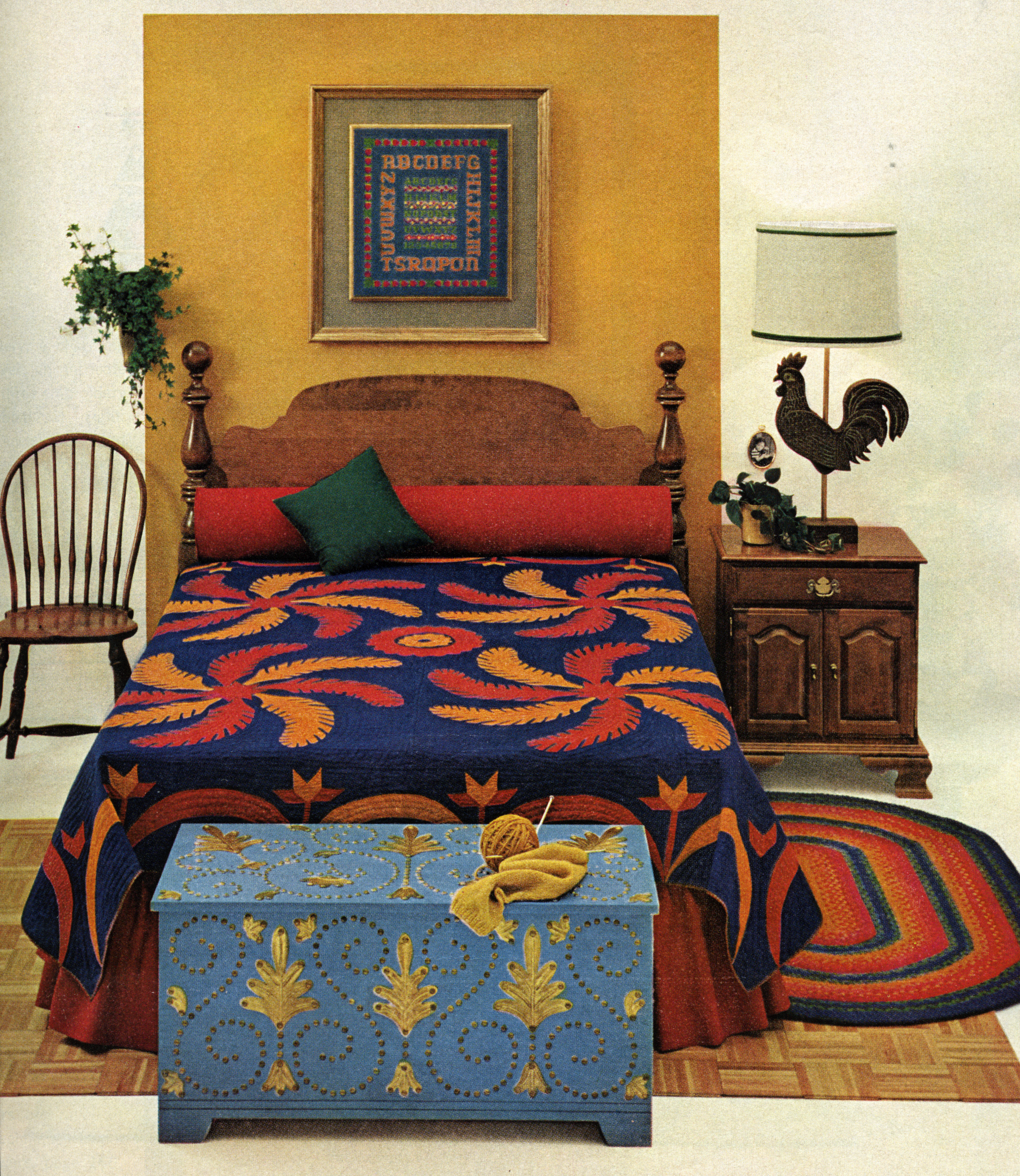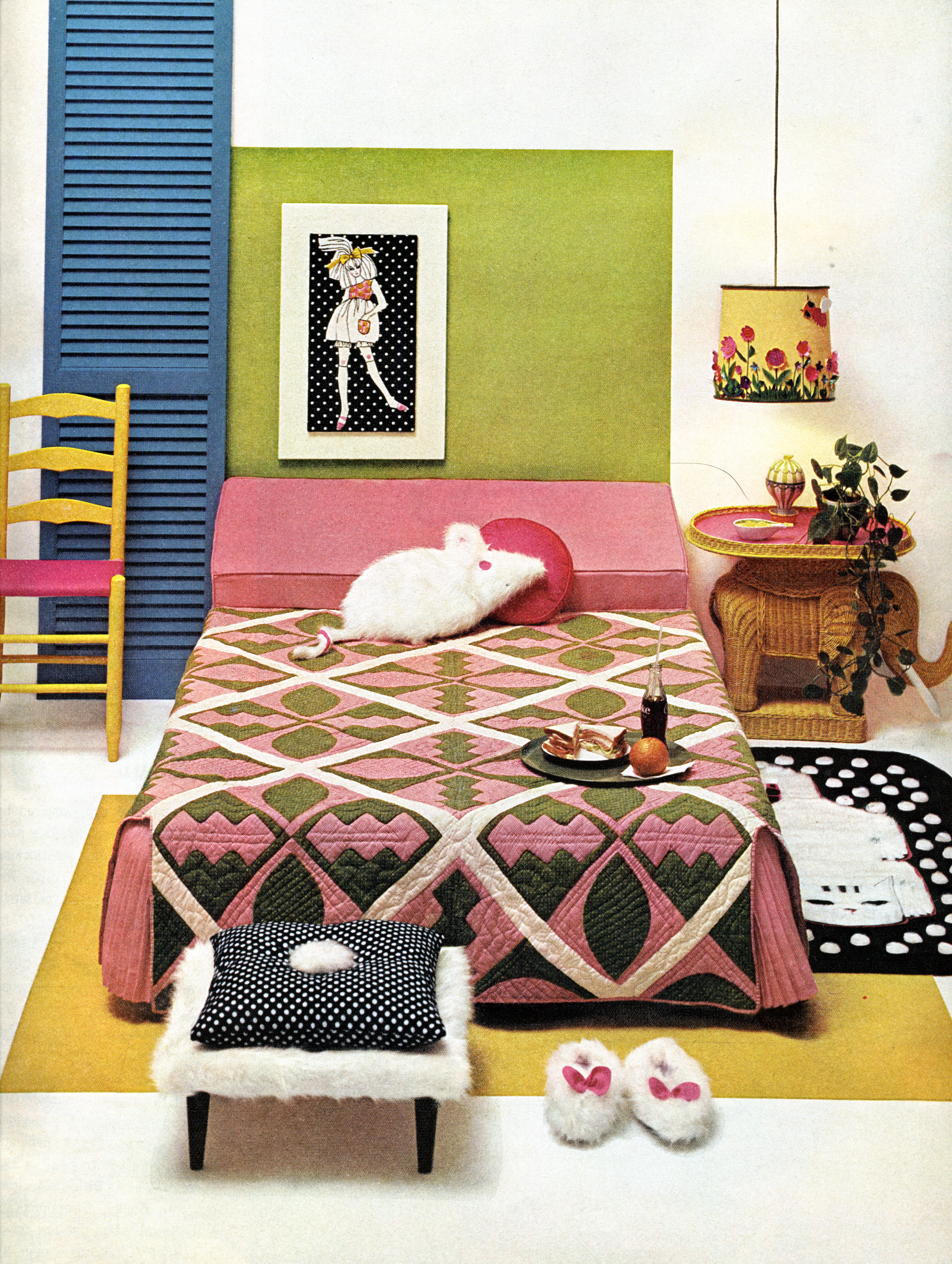 Going through my photo albums. Came across some pictures I’d taken from a 1960s McCall‘s Magazine. They are DIY décor ideas for a master bedroom, a teenagers room (above) and a bathroom. The colour schemes are a little too groovy, but I kinda like the quilt pattern.