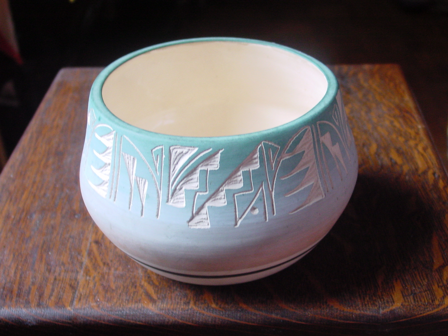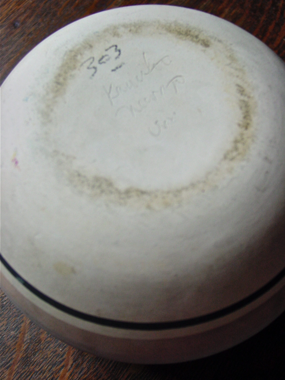 On the way home, I stopped off at the Goodwill. Maybe it’s because I had pottery on the brain, but I immediately spotted this pretty etched pot. It’s signed Kanuho Navajo. I bought it and brought it home to research. I believe, based on the signature and style of other pieces on the internet, that it is by Marie Begay Kanuho, who sold work through Mesa Verde Pottery in Cortez, Colorado. It’s not exceptionally old — it would be from the 1980s at the earliest. But it’s a lovely handmade piece. The outside is painted but not glazed, the inside is glazed. And just look at it—it just somehow seems to glow!