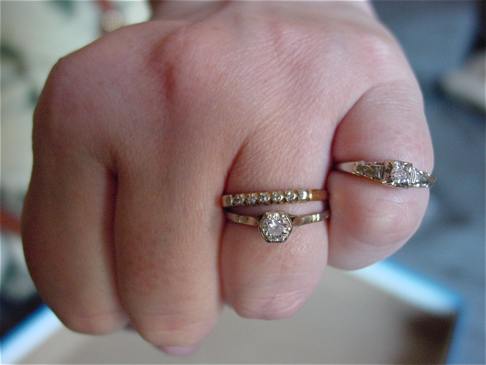 Next, I headed up to the Value Village at Danforth and Woodbine. It was a gold mine, I tells ya! The big “get” of the day was this 18k white gold engagement ring mount signed Birks (pictured above on my pinky). It was only $5. Judging by the styling, I’d say it’s from the 1930s or ’40s. The stone is just something I had lying around and is not properly set. I think I might try and find a tiny emerald to put in the mount. Or I might just use the gold for a project I have in mind.