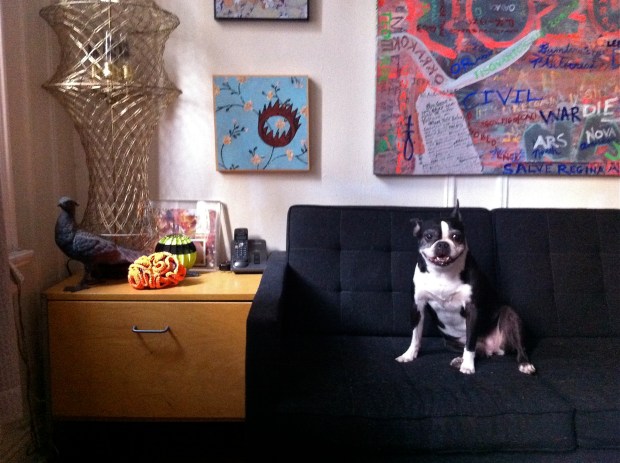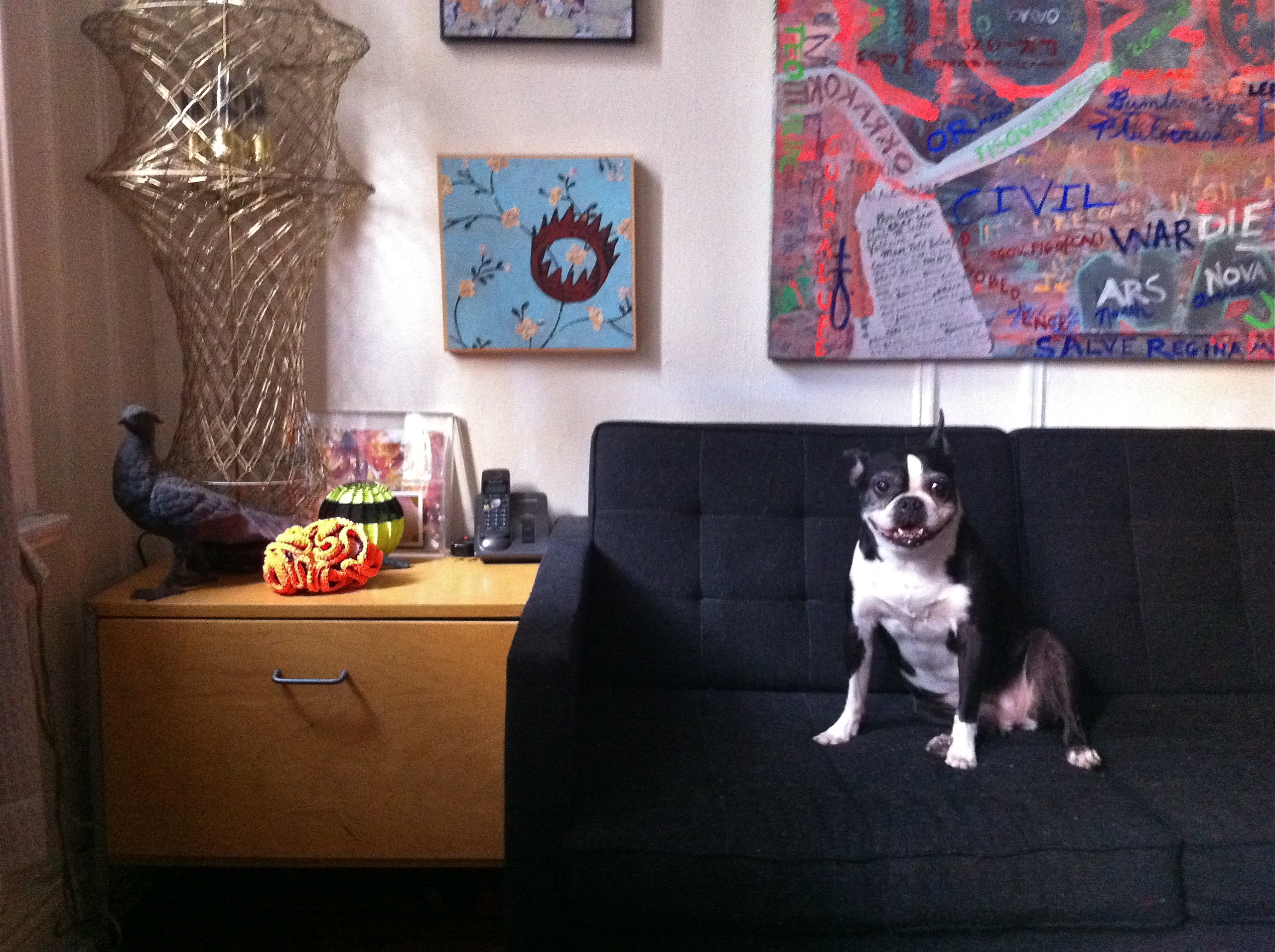 I feel sort of bad for going to Manhattan and buying clothes I can get here, but they do have a better selection of sizes in the states for an ample gal like me. Plus, I smelled like a wet dog. And speaking of dogs, look at little Elliot here. I was staying with my friend Gary, and made my way to his apartment to change into dry garments and pal around with the pooch.