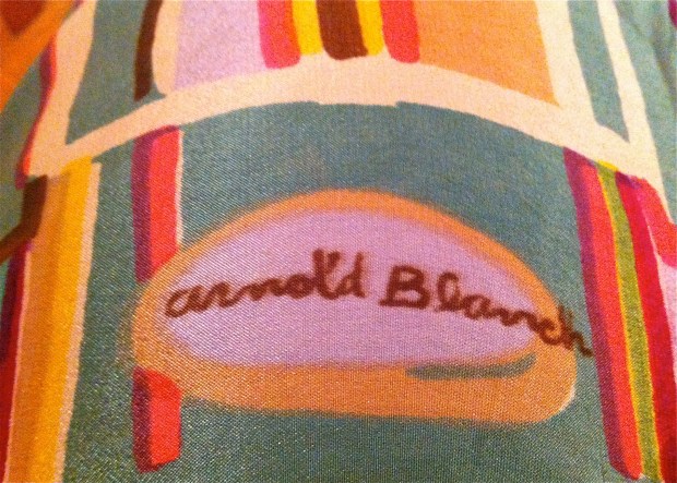 I fond this colourful scarf, signed Arnold Blanch, at the Woodbine Value Village on Sunday afternoon. I was immediately drawn to the vibrant imagery because it reminded me of medieval Tuscan hill towns (everything reminds me of Tuscany). A bit of quick Googling revealed that Blanch was an American Modernist painter, printer and illustrator. He went through a long social realist phase and worked for the WPA during the Depression. After WWII, he adopted a livlier, more abstract style and a brighter palette.