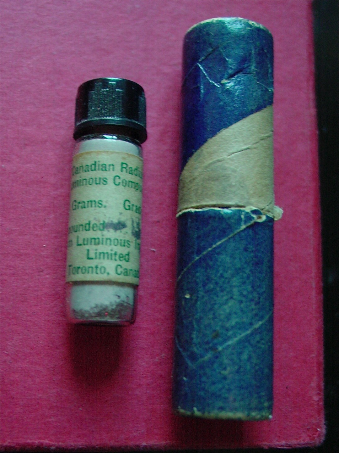 And finally, a vial of watch lume. According to the Canadian Nuclear Safety Commission, Low-Level Radioactive Waste Management Office, radium luminous paint is considered “historic waste.” So yeah, this is on it’s way to LLRWMO.