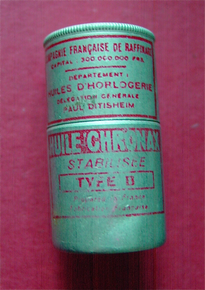 I bought a box of old watch bits at an auction over a year ago. My summer mission is to declutter, so I’ve been going through the box, sorting out what’s repairable, what can be used for crafts, etc. And I found these old, odd bits of packaging. First up, a tiny box of lighter flints, pictured above. And below is a tin that held watch oil.
