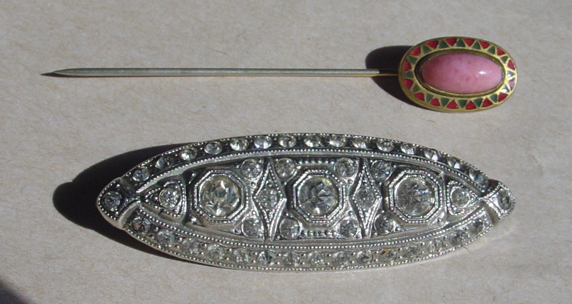 Today, it’s a pair of pins from the 1920s. One is an enamelled brass and glass Egyptian Revival style stick pin. The other a white metal and rhinestone brooch. Both are very pretty and would look great pinned to a collar.