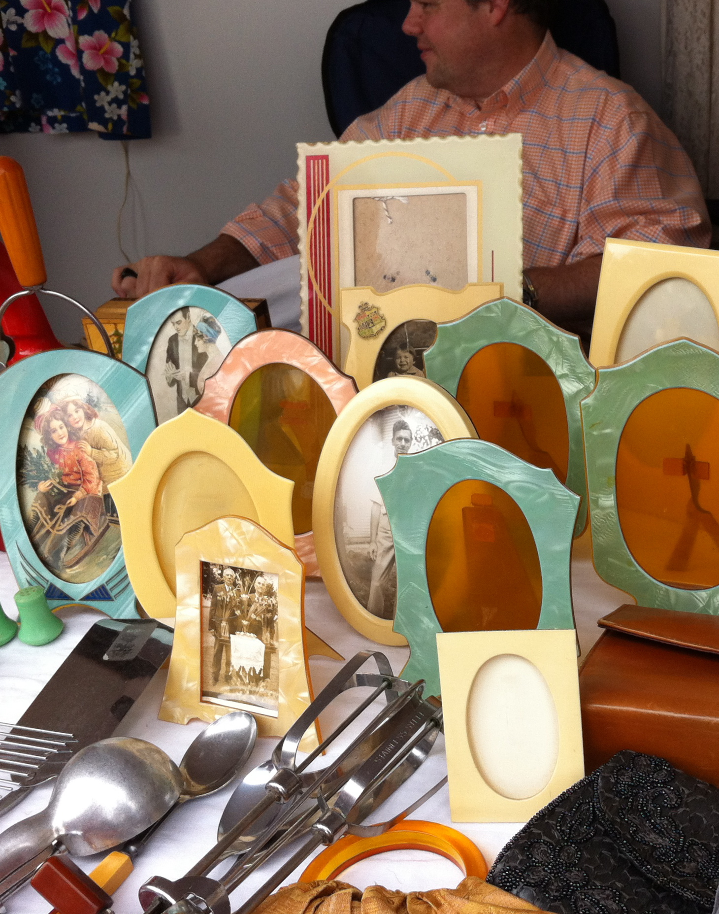 I know that most people associate plastic with cold and artificial things, but to me, these old plastics have a sense of playfulness. Celluloid (like these art Deco picture frames above) especially practically glows.