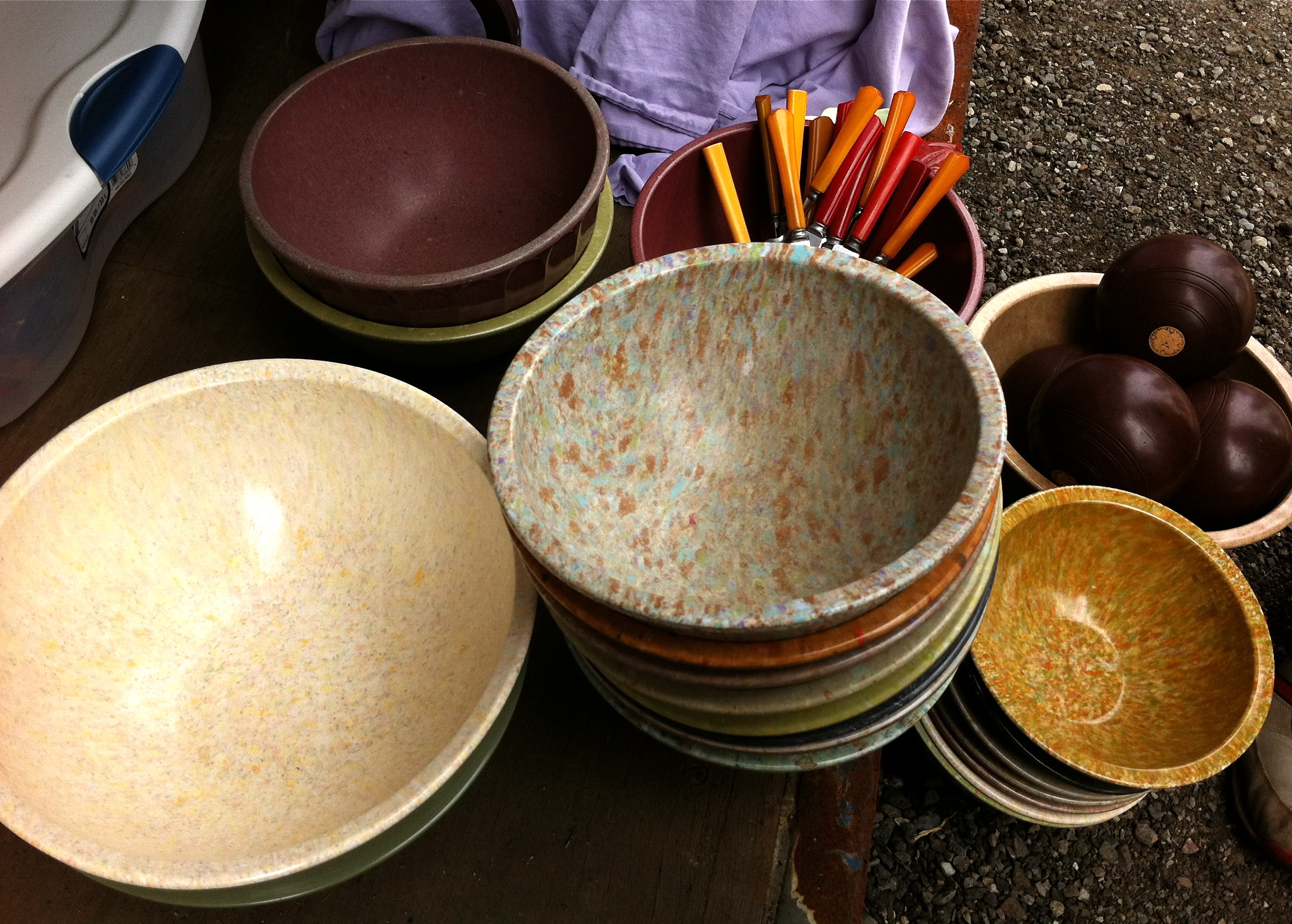 The August Junction Flea was a rousing success! I was able to find good homes for a lot of my old jewels and so far no regrets. I didn’t buy anything this time either (decluttering is the goal), but I did go on a little photo safari. I was impressed by the collections other vendors had amassed — such as the colourful collection of Texas Ware bowls pictured above.