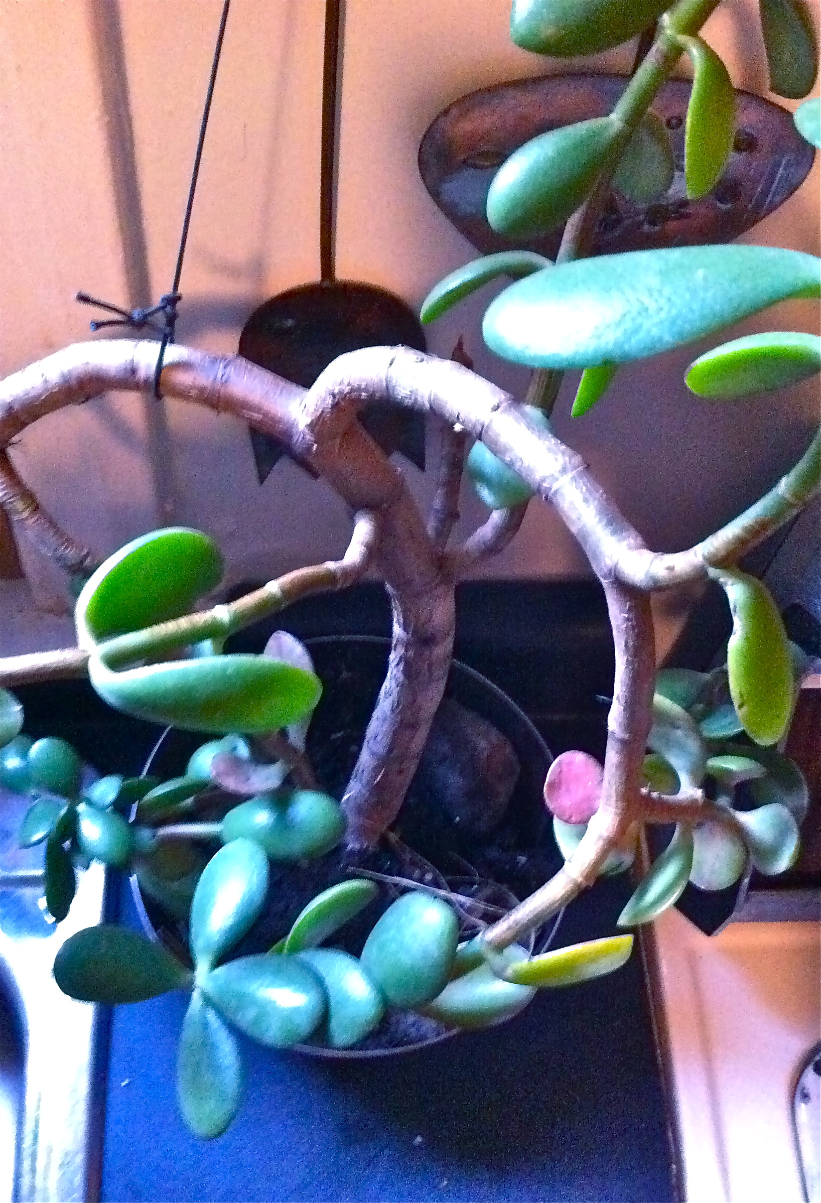 And then I found this jade plant (AKA friendship tree, lucky or money plant, Crassula ovata) on the sidewalk on my way home from work on Tuesday. It had never been transplanted from its original tiny plastic pot and apparently had grown too big for its britches and abandoned. I have temporarily transplanted it to a larger container but with out strong, deep roots its going to keep toppling over. So I’ve suspended it from the wall for the time being until I find a nice big urn with support stick.