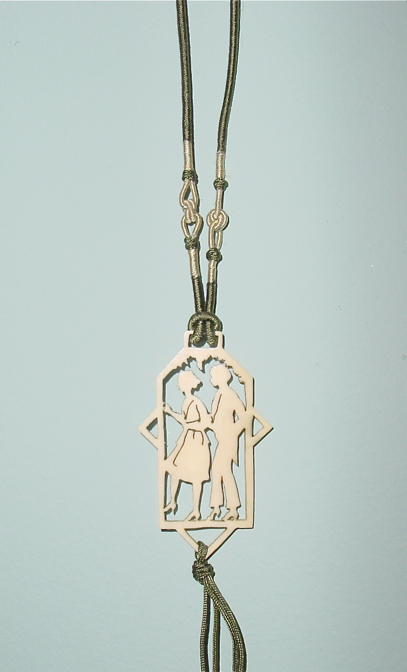 So I attached a jade green and ivory cord to the pendant (and used some left over thread to make a tassel). While I’m not sold on the tassel, I think the rest looks pretty awesome.