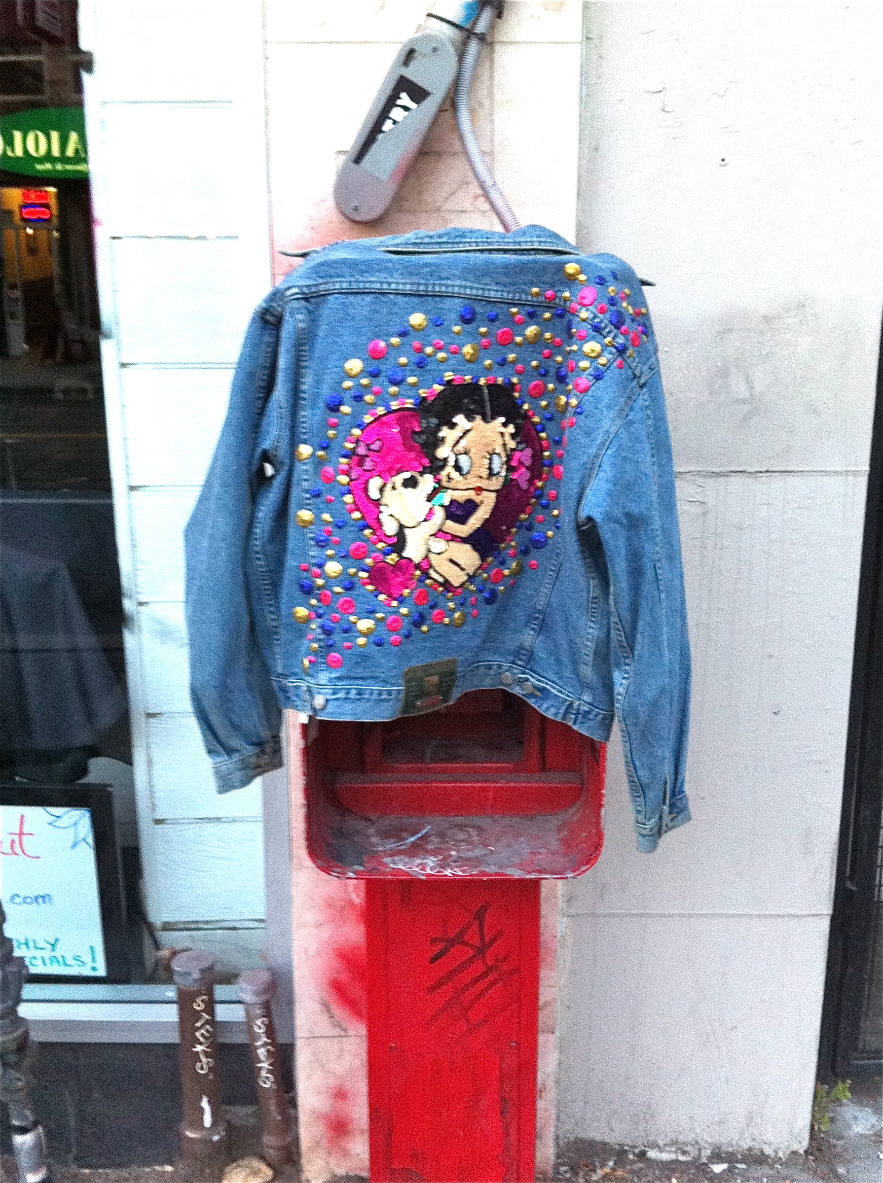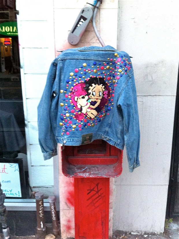 My nephew and I were walking down Queen St. West to go to Banh Mi Boys to get the hobbled Mr. Andrew a selection of pan-Asian foodstuffs when we spotted this classic 1990s-era bedazzled jean Jacket hanging off an old public telephone stand. While I was sorely tempted to nab it, we left it in situ. This happened on the weekend. I hope it is still there.