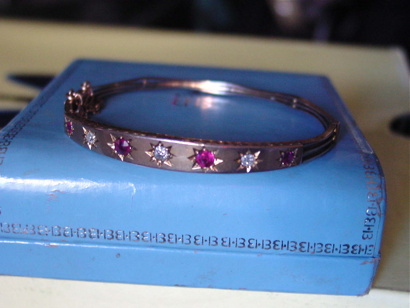 I’ve been dying to show off this recent acquistion: An early 20th century, 9 ct diamond and ruby hinged bangle bracelet. Please excuse my tardiness, I’m a bit behind in photographing my most recent jewellery finds. Whenever I start a contract, I like to reward myself with something I’ve wanted for a long time. Like a fine Edwardian bracelet (yes I have gold filled versions, but this one is fancy!). I got this bracelet at the same auction where I got the Seiko. So I rewarded myself twice this time. And to punish myself for giving myself a treat for essentially doing nothing, October will be a no-shopping month.
