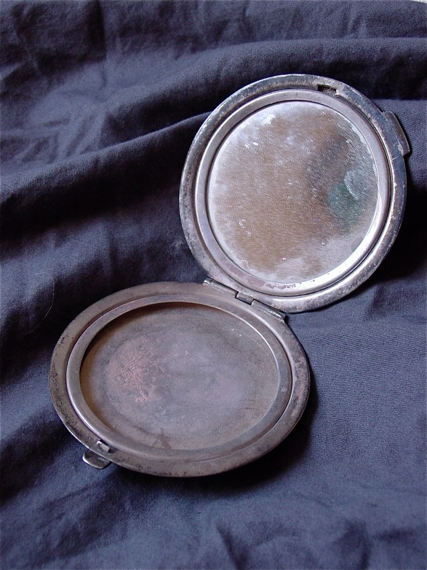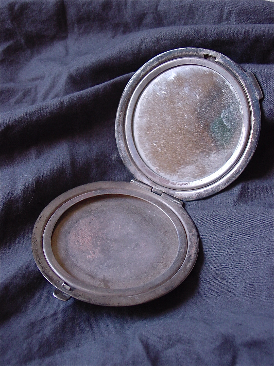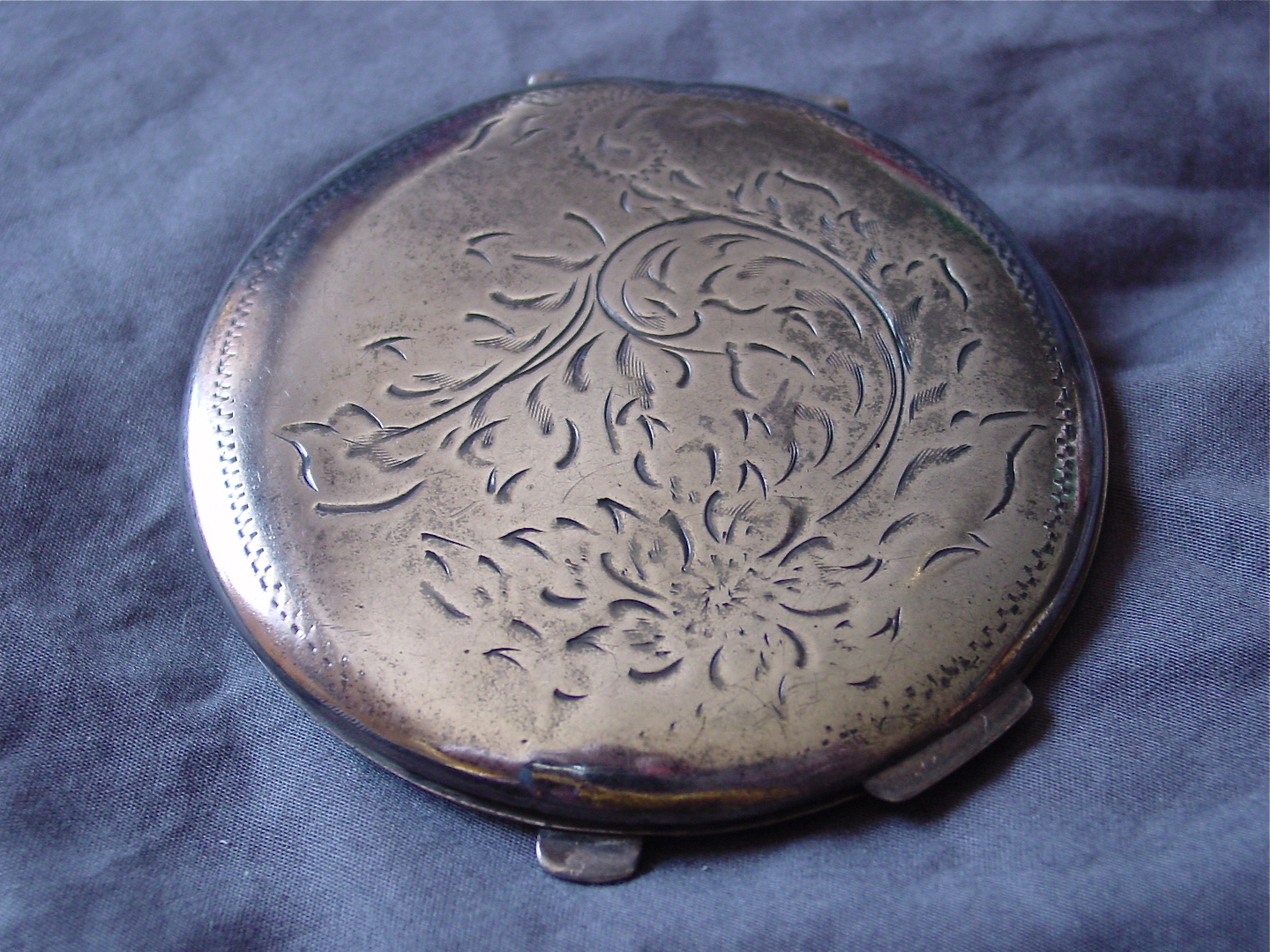 I found this old compact in a lot that I bought in an auction. I kind of tossed it to the side because I don’t really know what to do with things like this. It is old looking, but how would one refill it? And without makeup in it, it doesn’t seem particularly useful. I gave it a second look recently and noticed that it was stamped “Sterling,” so a semi-polished it up. It’s a prettier object now, but I still don’t have any need for it. I wonder what people do with their solod gold, jewel encrusted lipstick holders and such?