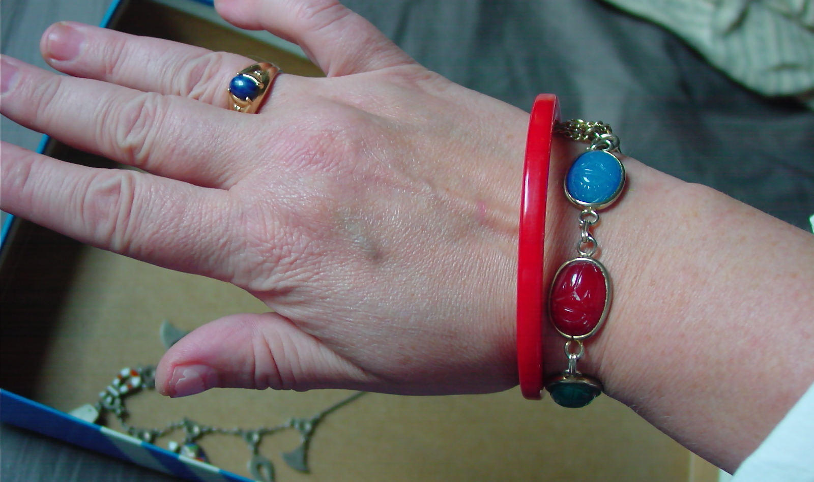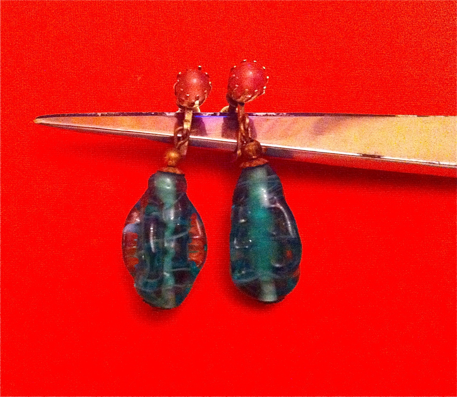 In the 1920s, this “Oriental” look had trickled down to the masses, and precious stones were replicated with inexpensive glass and plastics. Even pieces that weren’t influenced design-wise, still took clues from the colourfuls gems. While nowhere near as ornate as the Cartier pieces, Here’s a few deco and late deco thrift shop finds that pay homage to the carved gemstones of that era. Above, a 1940s or ’50s lucite scarab bracelet, a star sapphire ring and a cherry red red Bakelite bangle. Below, moulded glass and brass drop earrings signed Coro.