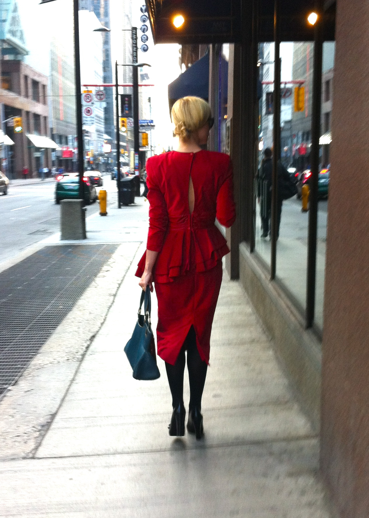 I saw this woman walking down Yonge Street last week and stalkerishly took a picture of her. She was like a fashion magazine spread come to life! Red suede peplum dress. Green Cartier handbag. Hair pulled back into an assymetric bun. All perfect. I saw her again a few days later and she was wearing loosely cut high-waisted trousers and a 1970s secretary blouse. She looked just as incredible. And I have been railing against the high-waisted look all summer long. I bet if this woman wore leggings as pants I would find it acceptable.