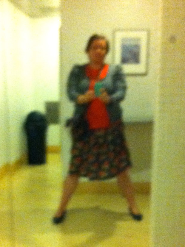 Sweater and orange top, both H+M. Vintage Liberty of London fabric skirt. Shoes, Rockport. Thrifted Benchmade crossbody bag.