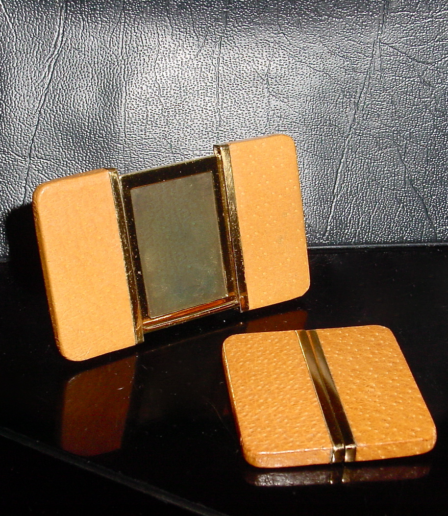 I found this pair of tiny travel photo frames in a bag of broken jewellery that I found at the Value Village. At first I thought they were 1990s-earrings, but when I picked them up I realized they were way too heavy to be worn as jewellery. The pigskin covering reminded me of old travel alarm clocks, and the shape of the classic Movado Ermeto purse Watch. So I gave them a tug and lo and behold they slid apart to reveal a tiny photo holder and stand.