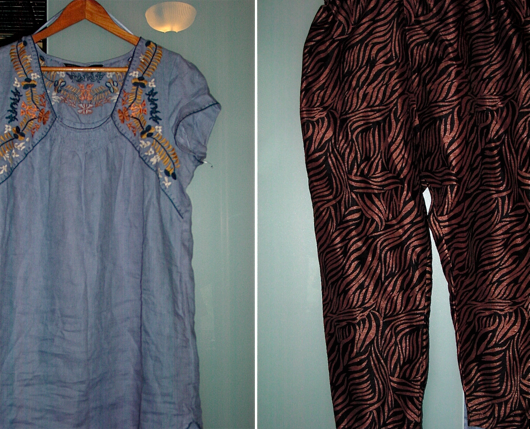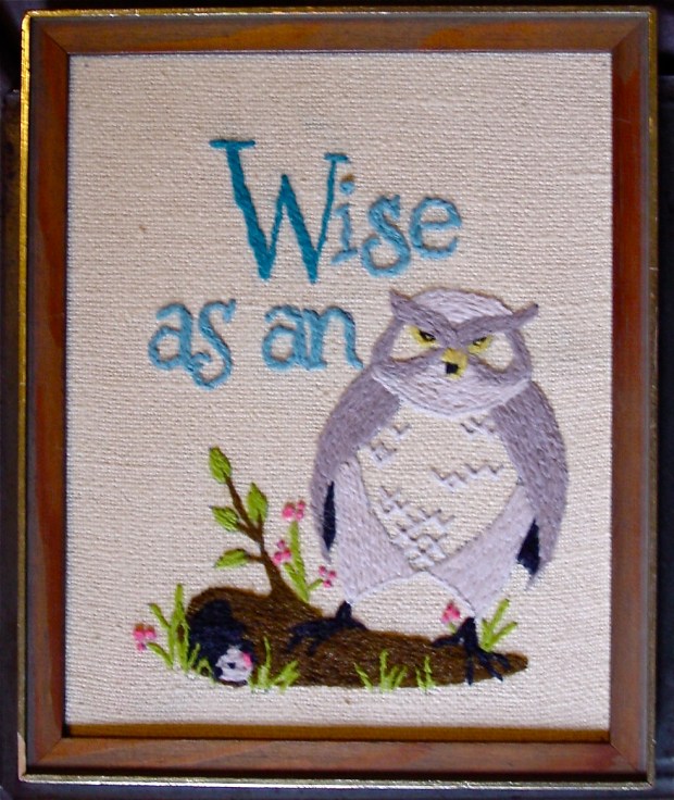 Unfortunately, it didn’t stop there.I still had two bags full of clothes and shoes to donate, so I hopped on the streetcar and headed out to the Value Village at Queen & Carlaw.I found a cool, camel coloured wool shawl, An embroidered faux Mexican dress for next summer, the owl stitchery pictured above, a pair of crazy silk “Hammer” pants, and an H.Stern pewter charm. I probably paid too much for the dress and pants, but the pendant was only 99 cents.