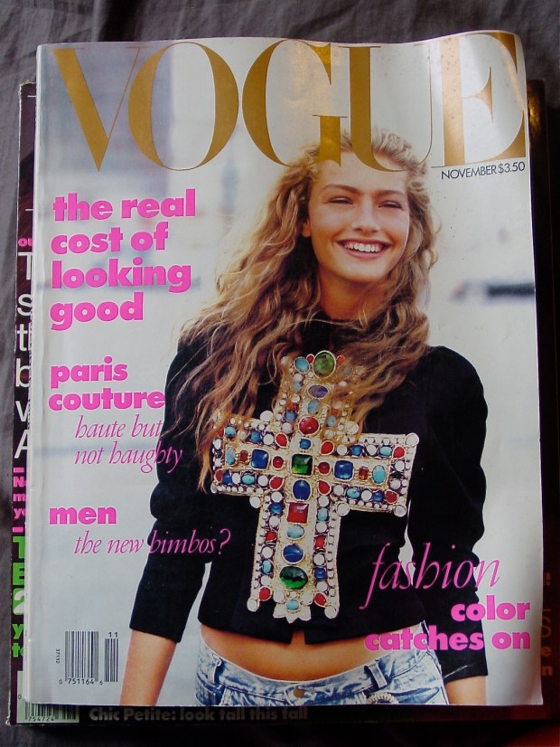 I came across a whole box full of fashion magazines from the late 1980s/early 1990s last weekend. Because I am trying not to be a hoarder I took only two. I grabbed the November 1988 Vogue pictured above because I remembered this cover of model Michaela Bercu wearing a super bedazzled Christian Lacroix so well. A little Googling also reveals that this issue was also Anna Wintour’s first issue as Editor-in-Chief.