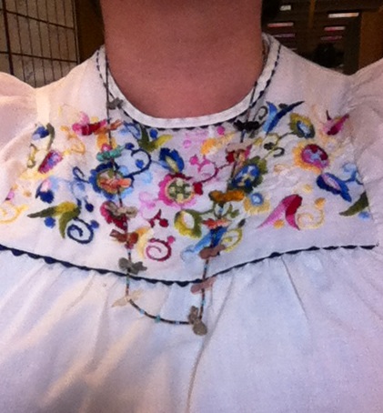 I found this delightful Zuni Fetish necklace in a bag of broken jewellery from the Value Village. It’s missing two little foxes, many of the little beasties have lost their tails and the string is very stretched. I have a whole bunch of repair projects and the goodie bag also had whole strands of heishi so I think I’ll do this over, mixing the fetishes with two strands with turquoise nuggets that I also happen to have lying around. Here’s me wearing the necklace with an embroidered top I picked up at the Salvation Army for $3 last Thursday.