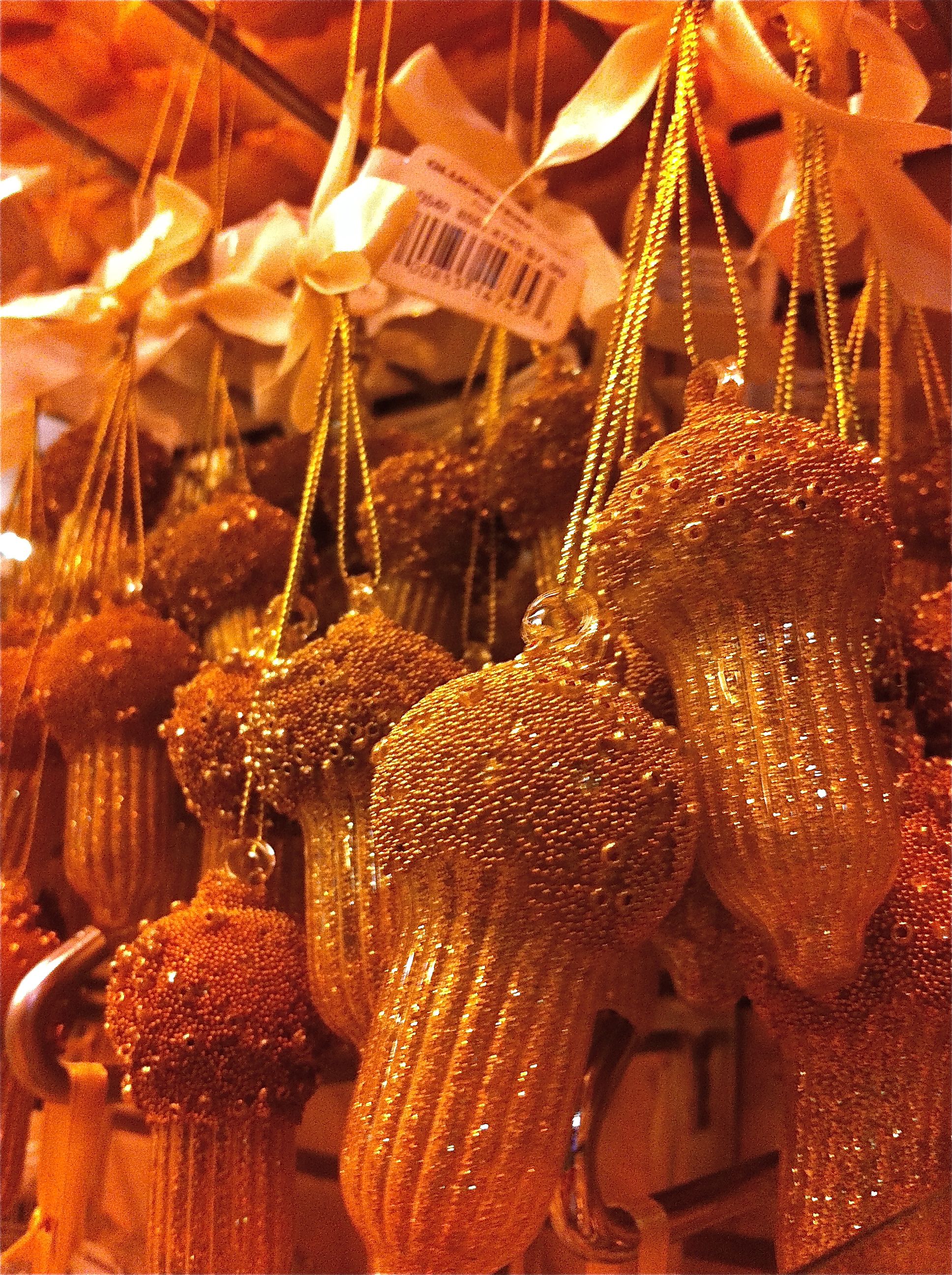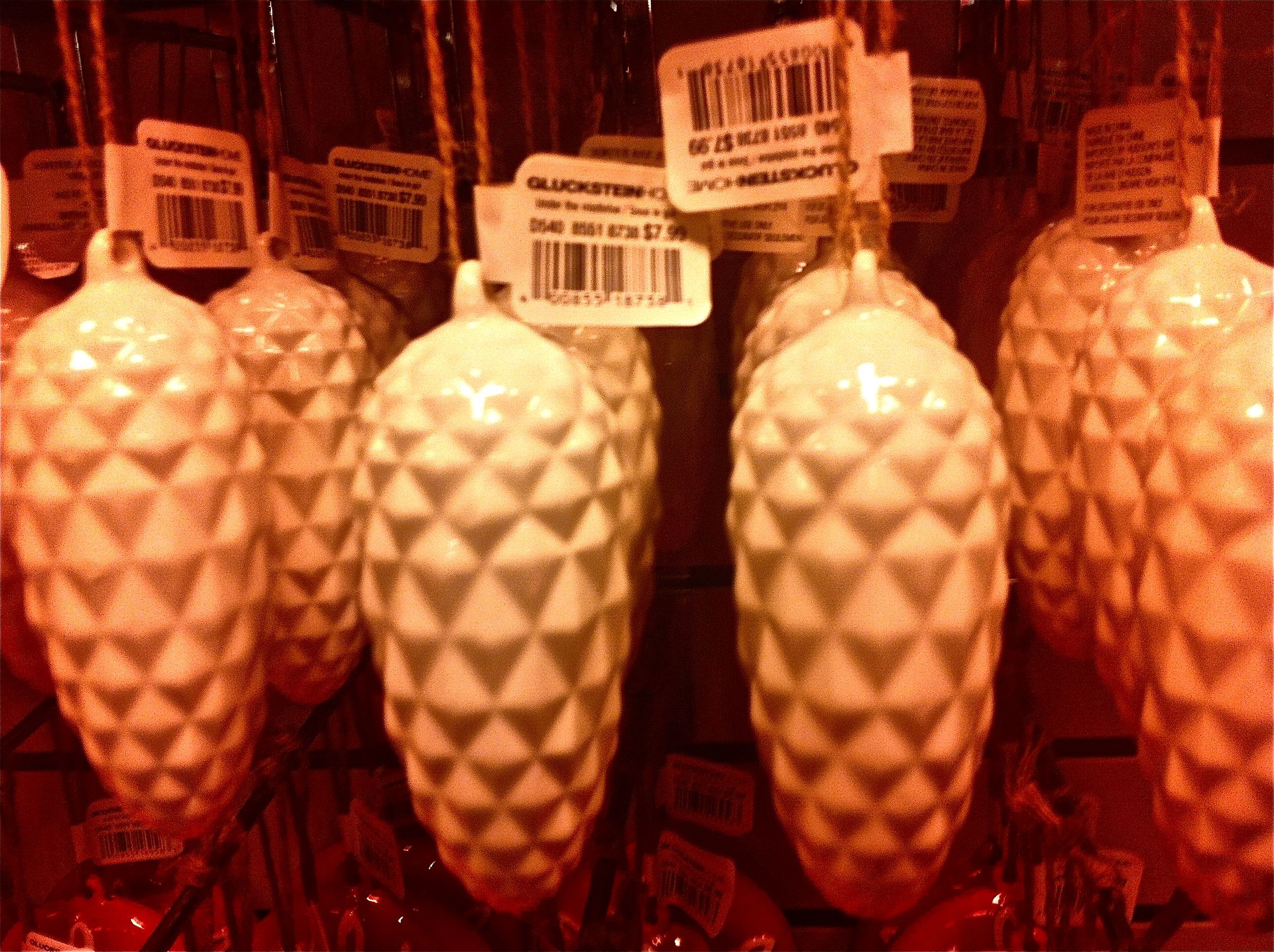 I am a fan of pretty things though. Last week, I attended the Bay’s Christmas Street presentation, featuring the GlucksteinHome holiday collection. Mr. Biran Gluckstein himself was in attendance talking about some of his favourites. And I must say that many of the tablewares and decorations would look great at anytime of the year. Here are a few of my faves, starting with the biomorphic glass acorn ornaments pictured above. I could totally see making a mobile of these babies. The same deal goes for the ceramic pine cones pictured below.
