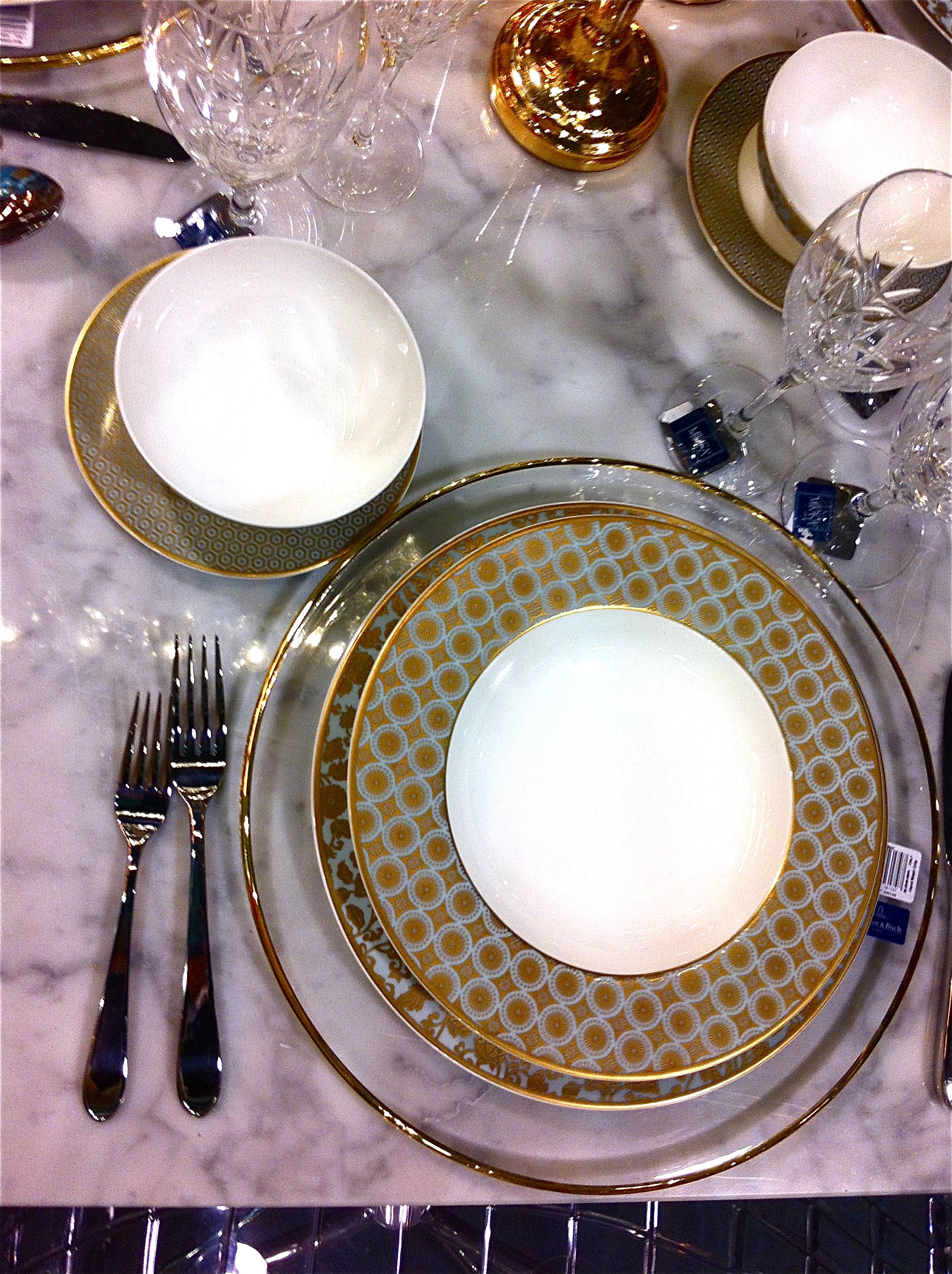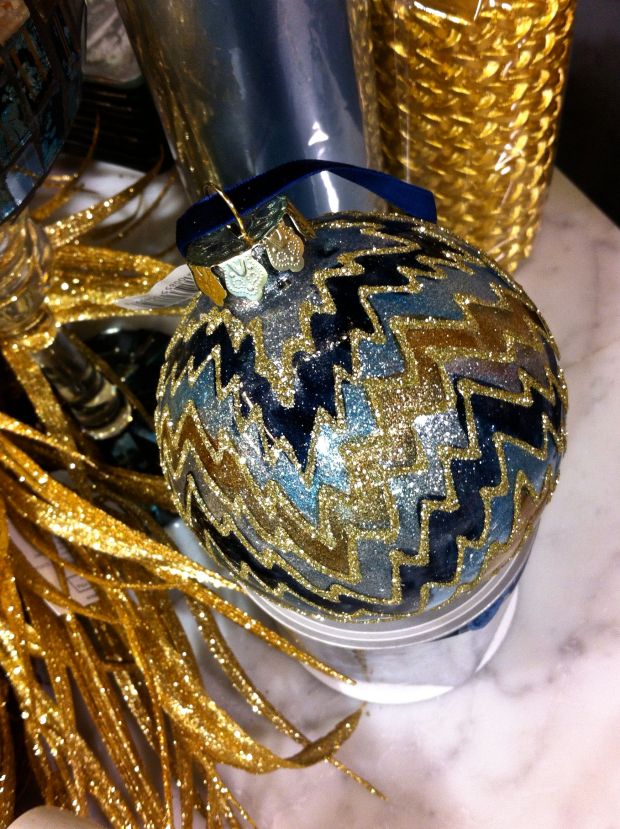 Mr. Gluckstein told us that this striped bulb was his personal favourite because it’s stripey pattern reminded him of his dad’s old Missoni sweaters. If I had a mantel or a dining room table, I’d fill a teak bowl with three of these ornaments just because! And if I had a dining table, I’d also set it with these mismatched plates. The gold and blue palette reminds me of the night sky!