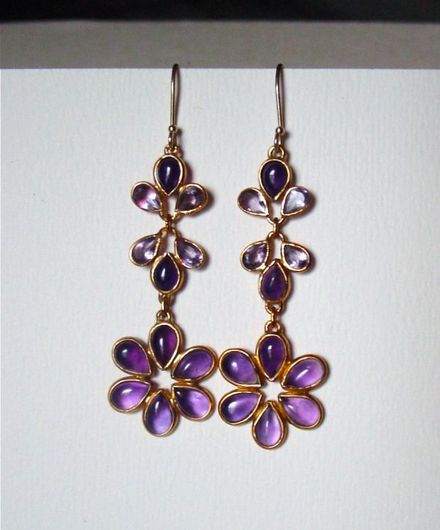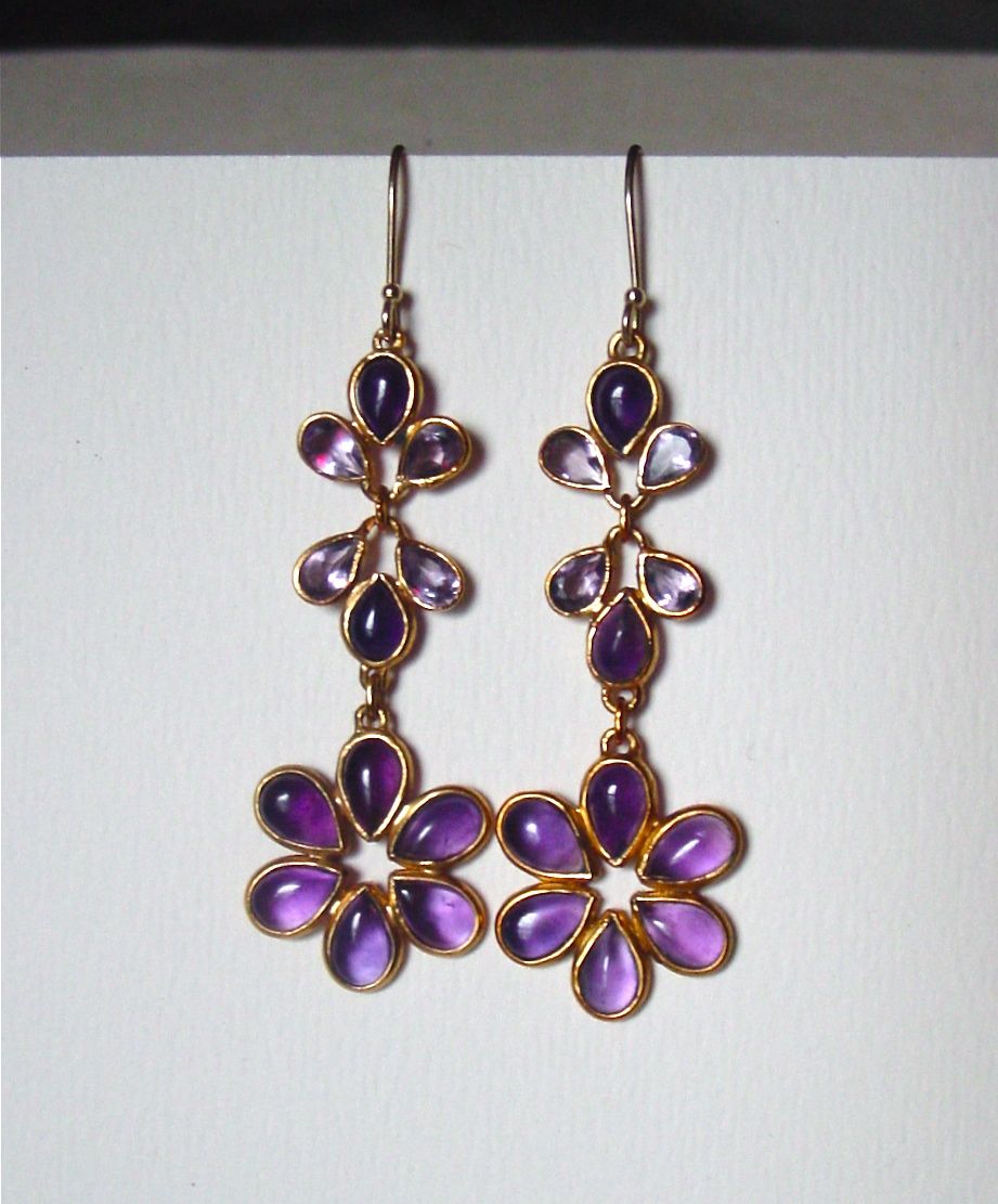 I found this pair of dangly earrings at the Value Village for four bucks a week and a bit ago. They are made of cabochon and facetted amethysts set in gold. I have been looking for fancy amethyst earrings (it’s my birthstone) for a while, and these are certainly very glam. Maybe too glam. And two of the stones have already fallen out (luckily at home where I was able to find them). I’ve reset them and they seem to be sturdy (for now). I’m trying to figure out if I should fix ’em or scrap ’em and have the stones reset. The most likely outcome is that they’ll sit in my jewellery box for years while I try to make a decision.