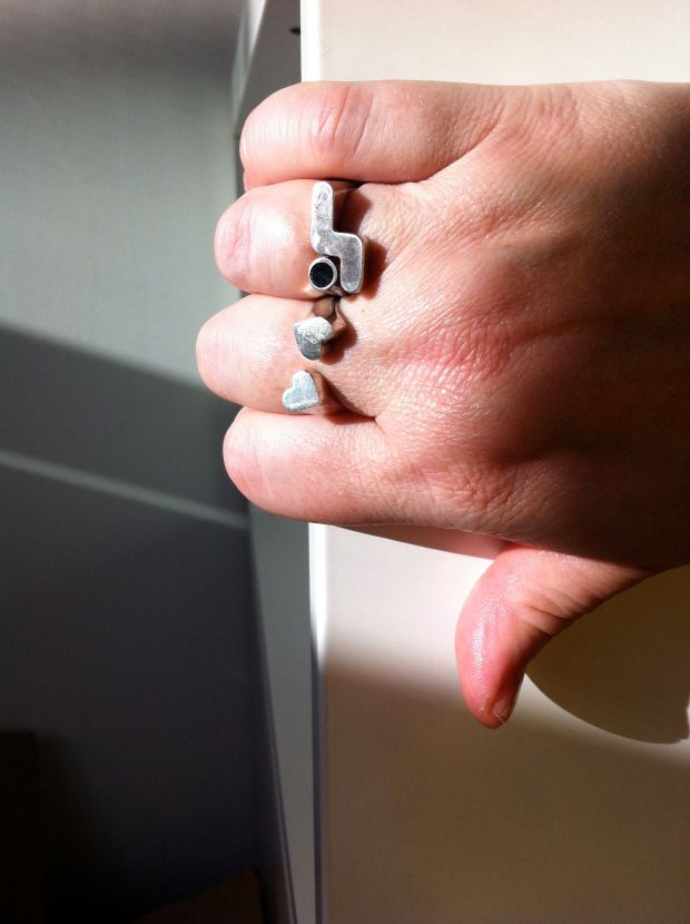 Don’t know much about these rings. I won them in an eBay auction — they came all the way from Australia! The seller said they were European. The onyx one reminds me of the graphics they used to use for Olympic events in the 1970s. Like, this would be the icon for sitting.