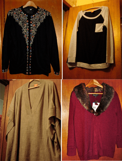 It’s getting cold out and I’ve had a major sweater jones. In the last couple of weeks, I’ve bought (clockwise from top left) a vintage Italian wool jewelled cardigan that I thought it looked very D&G FW 2013, a grey and sheer Joe Fresh pullover that I thought it would be super cozy but is a bit squishy in the boobs, a fur-trimmed Jones New York cardigan ‘cuz I hated the clothes I was wearing to work on Thursday and a Joe Fresh poncho-like sweater that is just perfect and was on sale. Heck, they were all on sale.
