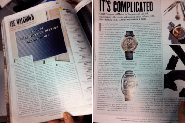 I’ve been doing some writing about watches for a magazine called Du Jour which launched last September. While it’s available online, my friend (and Du Jour‘s Executive Editor) Nancy Bilyeau was in town last week and dropped off some hard copies of the mag. I know I exist largely in cyberspace, but there’s just something so substantial about a magazine that’s printed on paper. The smell, the feeling of the stock and the sheer weight in one’s hands. Not only is it a beautiful magazine, it’s also a pleasure to read.